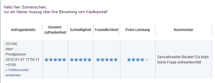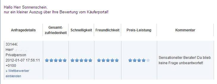 Auf dieser Seite haben unsere Kunden das Wort. Dieser Bereich befindet sich noch im Aufbau, da wir zunächst unsere Kunden um Erlaubnis zur Veröffentlichung fragen. [Namen wurden zum Teil aus Datenschutzgründen unkenntlich gemacht. Bei Interesse stellen wir nach Rücksprache gerne einen persönlichen Termin vor Ort mit Referenzkunden her]